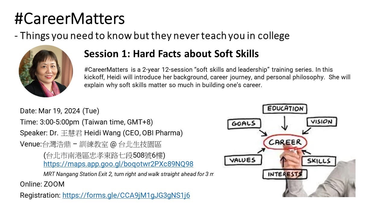首場課程將由台灣浩鼎的執行長王慧君博士分享她的故事、其職場生涯,邀請您進一步了解軟技能對職業成功的重要關鍵性。CareerMatters,是大學未教的職場必修課。