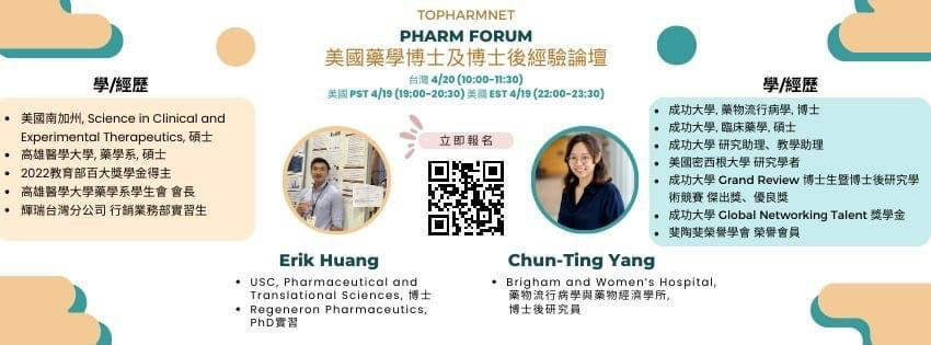 PharmForum 舉辦線上講座,美國藥學博士及博士後經驗論壇(Academic Journey as a PhD and Post-Doc in the United States)。對學術研究、出國留學、生物資訊等主題有興趣的朋友歡迎報名參加!