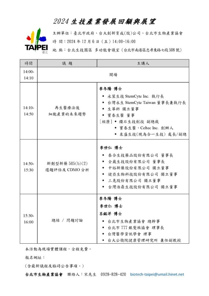 地點:台北生技園區 1樓 第三會議室(台北市南港區忠孝東路七段508號)