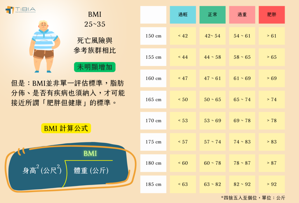 相較下,體重過重則未必意味著更高的風險,BMI在25~35之間而被列為過重或肥胖的人,其死亡風險和參考族群相比,並未明顯增加,這種現象被稱為代謝健康,或是「肥胖但健康」。
