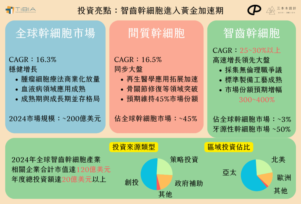 截至 2024 年,全球智齒幹細胞相關企業總估值已突破 120 億美元,單年資金投入約 20 億美元之多。投資結構上,風投佔比最高(52%),區域分布則以亞太最為活躍,佔全球 61%。