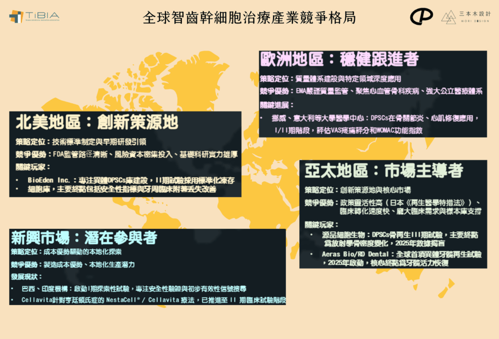• 亞太:成為全球成長引擎,中、日、韓扮演關鍵角色。中國投資規模龐大,日本則依靠《再生醫學特措法》推進牙髓再生,韓國以「牙齒銀行」模式整合存儲與臨床。