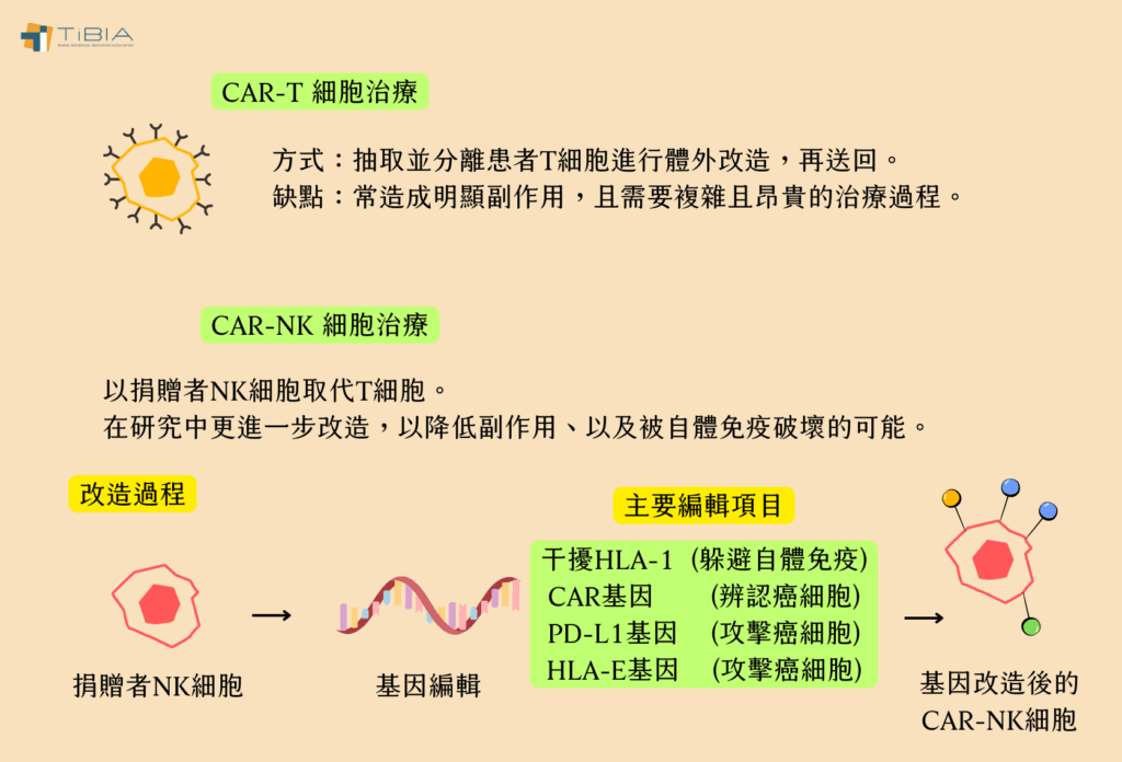 圖、改造後的CAR-NK細胞具有強力抗癌細胞與躲避自體免疫能力。(TiBIA製圖)