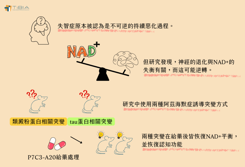 研究團隊透過多種臨床前小鼠模型,以及人類阿茲海默症患者大腦的研究,發現大腦無法維持NAD+(菸醯胺嘌呤二核苷酸,大腦核心細胞能量分子)的正常濃度,是阿茲海默症的主要驅動因素,而維持適當的NAD +平衡,可以預防甚至逆轉這種神經退化性疾病。