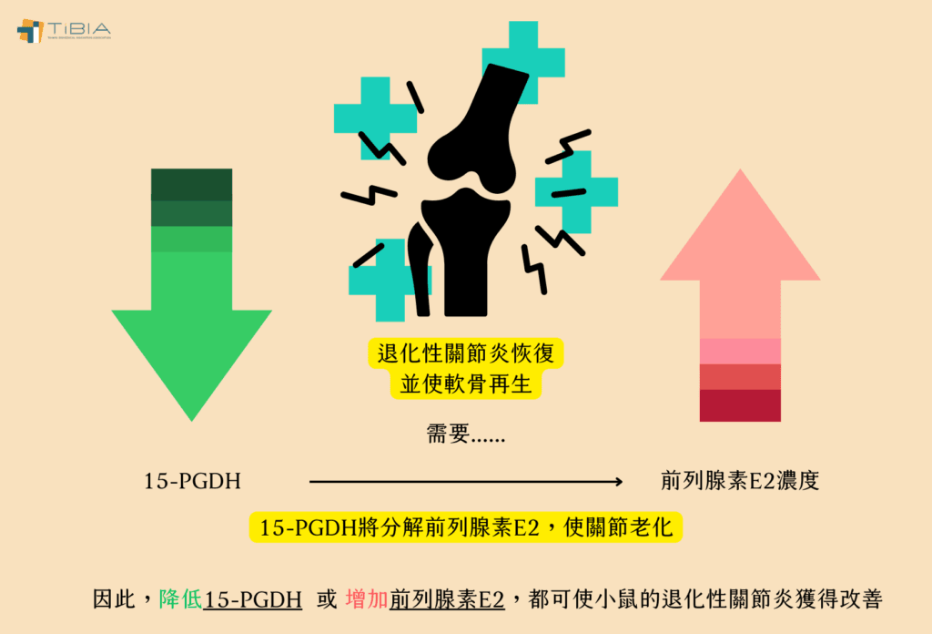 圖、15-PGDH與前列腺素E2對退化性關節炎的影響。(TiBIA製圖)