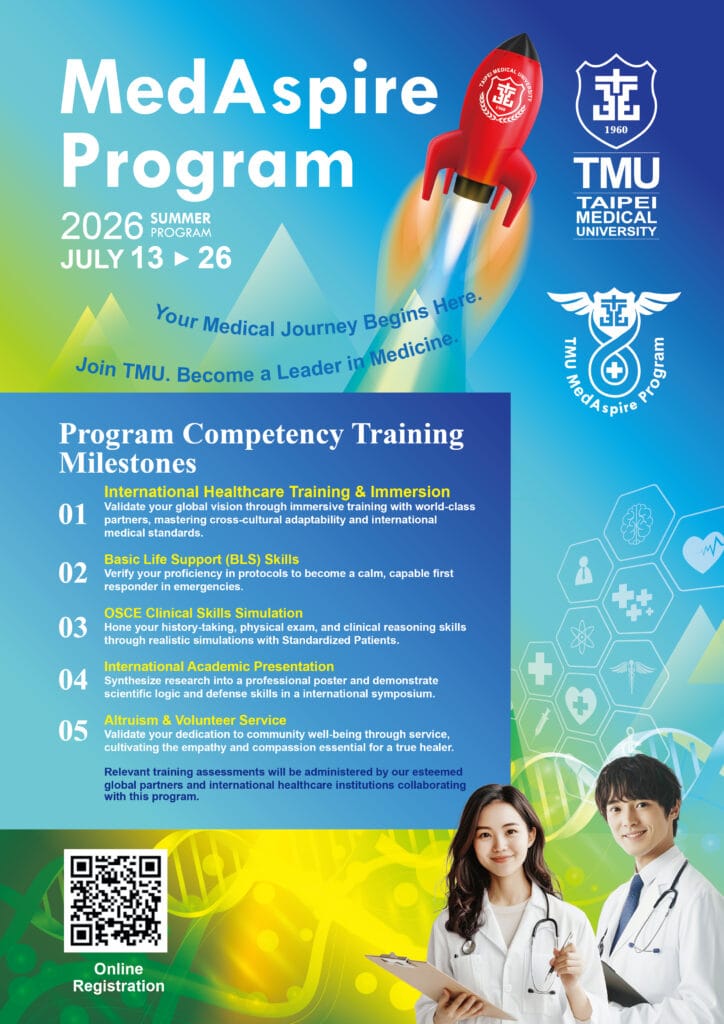 The TMU MedAspire Program is an exclusive, high-impact pre-medical training program designed for ambitious students who aspire to pursue a career in medicine. Hosted by Taipei Medical University (TMU)—a globally recognized leader in medical education this program offers a unique combination of world-class academics, hands-on clinical training, and cutting-edge medical innovation.